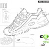 ホワイトのラバーソールの上にホワイトのテクスチャオーバーレイがあるブラックサテンアッパーを特徴とし、内側の裏地にメタリックゴールドディテールと多色の模様がデザインされる。